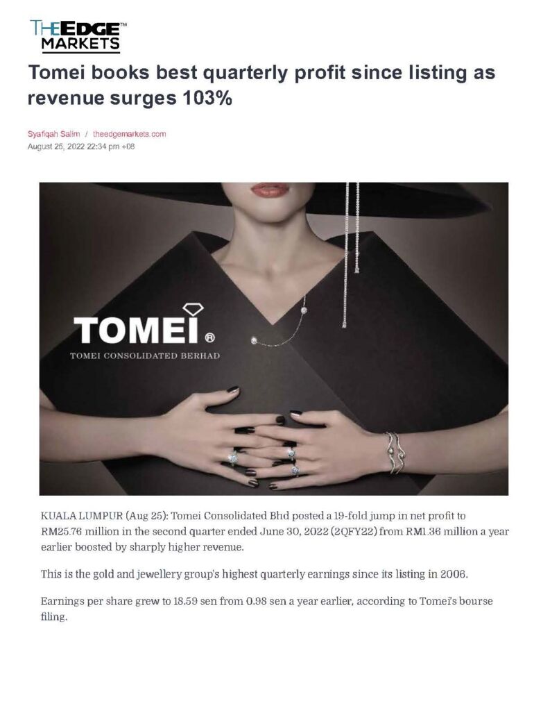 Tomei books best quarterly profit since listing as revenue surges 103%